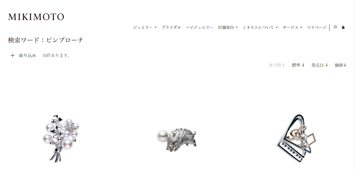 世界的に知られる国内のブランド「ミキモト」では、あこや真珠をあしらった上品なブローチを揃えています。