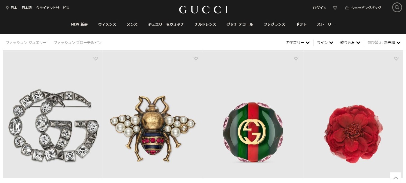 イタリアのブランド「グッチ」では、ファッション性の高い独創的なブローチを展開しています。