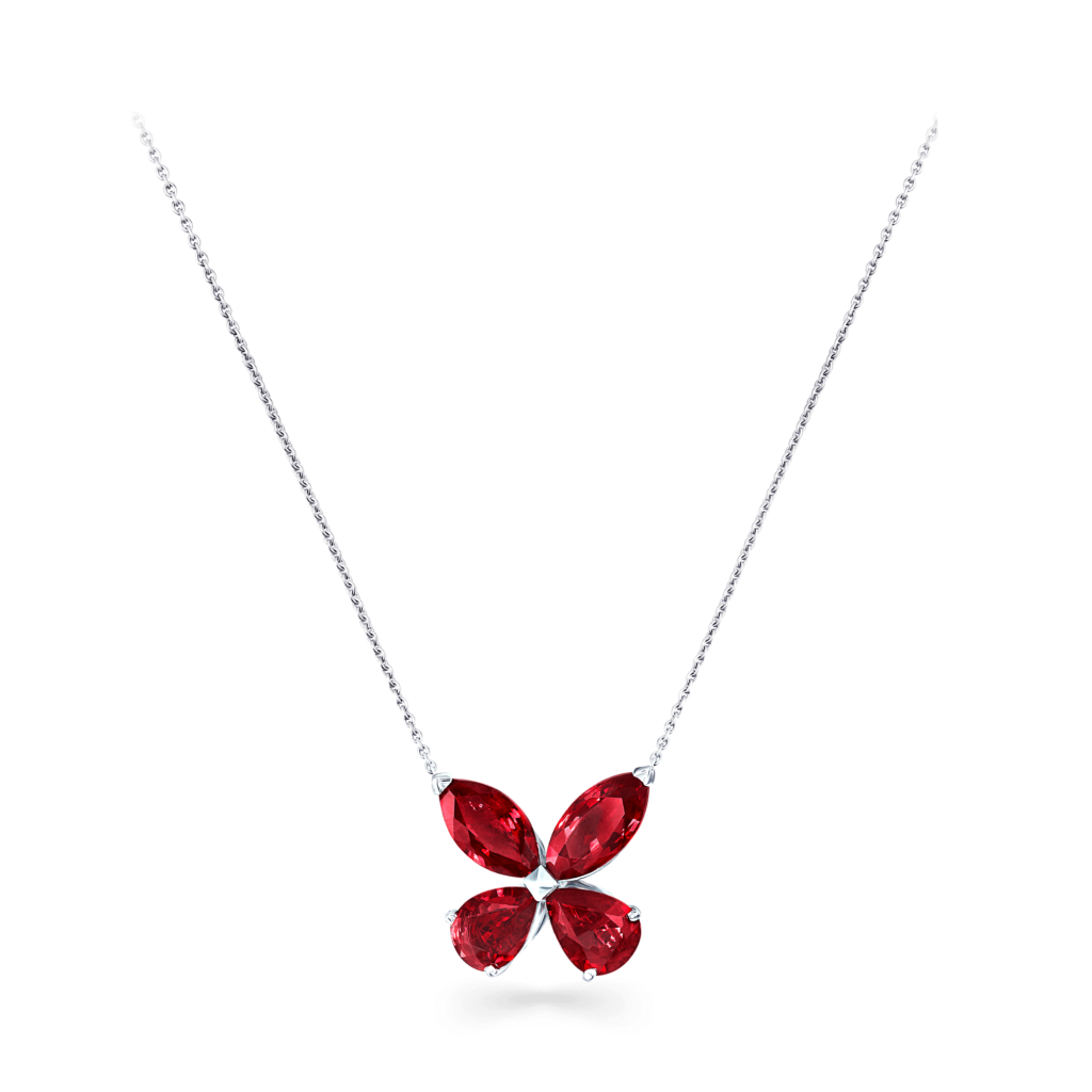 ペアシェイプとマーキスシェイプのルビーを蝶のモチーフに象ったネックレス。ダイヤモンド、サファイア、エメラルドのネックレスも発表されています。