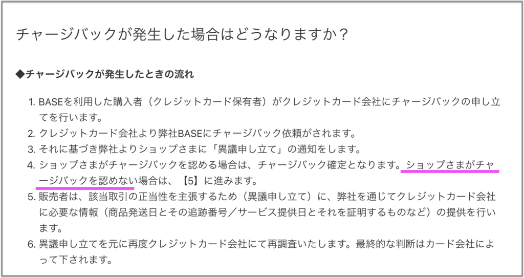 このBASEの場合、こちらのヘルプページに店舗がチャージバックに対して「異議」を申し立てることができることが明記されています。