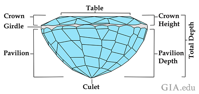 一般的なブリリアントカットは、テーブル、キューレットと、三角とひし形を組み合わせたファセット面で構成されています。