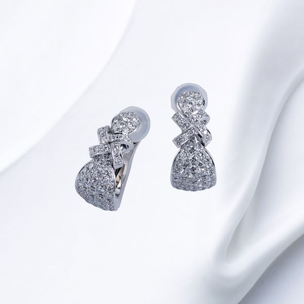 俄の人気シリーズ「KANO・叶」のイヤリング。ボリュームを持たせつつドレープ感を取り入れたデザインに、ダイアモンドを配した華やかなイヤリングです。