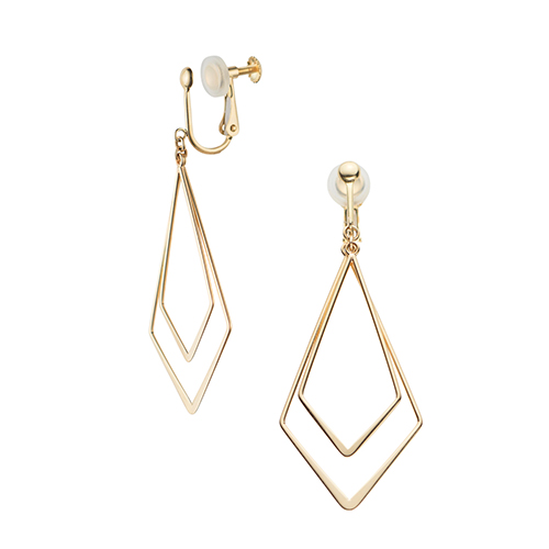 イエローゴールドの光沢と重なりあうひし形のモチーフで存在感のあるイヤリング。パーティシーンなどで、顔周りをより華やかにしてくれそう。