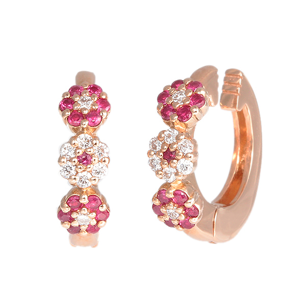 ルビーとダイヤモンドのフラワーモチーフイヤリング。ピアスのように見えるイヤリングは着け心地も良く、顔周りを華やかに彩ります。