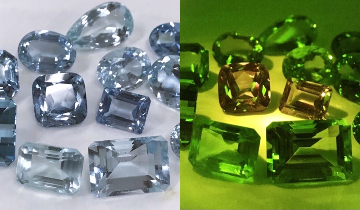 アクアマリンとして買い付けられた宝石にペンライトなどで光を当てながらカラーフィルターで覗いてみると・・・