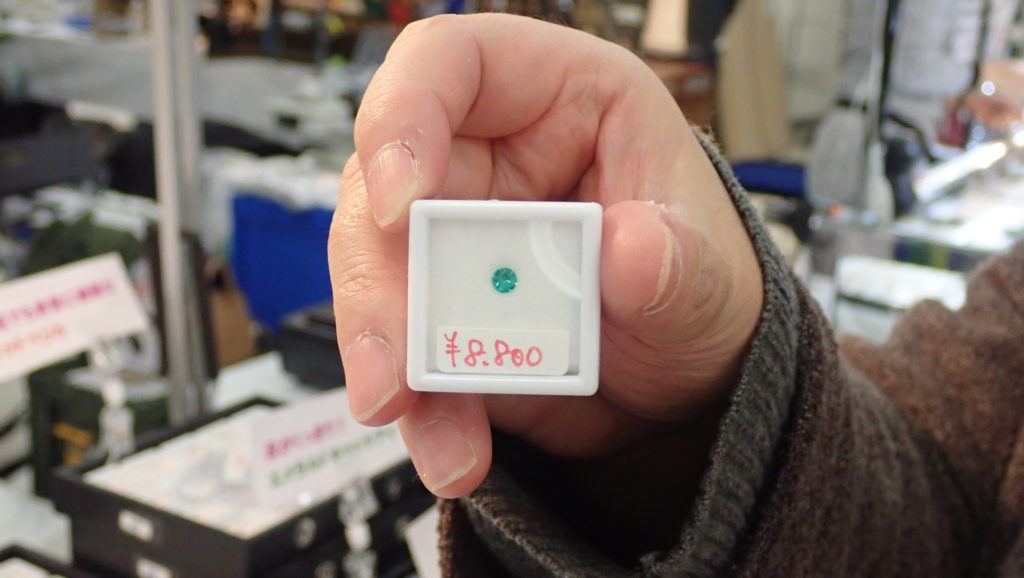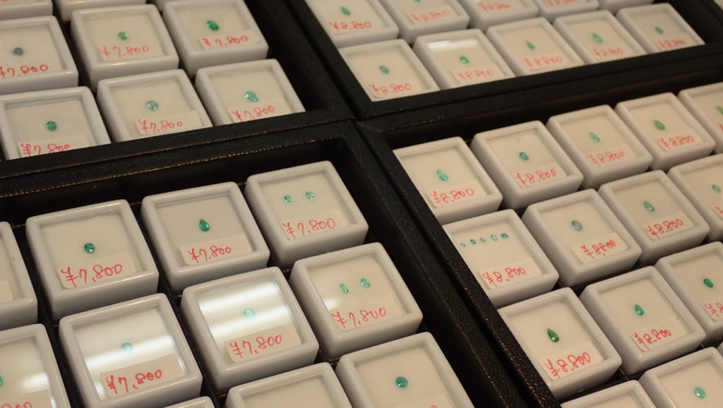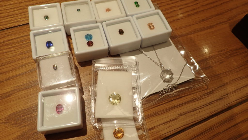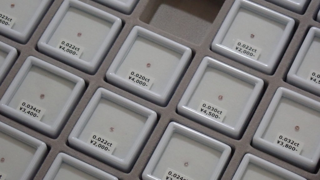 これは、当然ビビットではないものの全部ピンクに見えました。他のルースもお手頃だったので、私はピンクダイヤモンド、彼女は1,000円前後のルースをいくつかチョイス。
