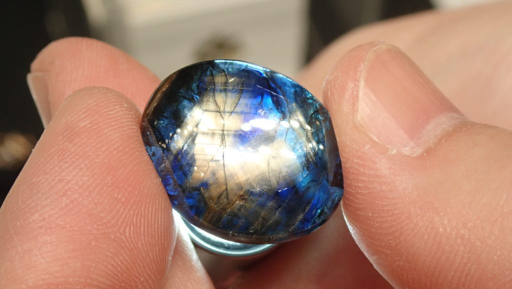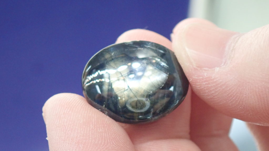 こんな感じの濃紺にゴールドが入ったサファイアですが、裏から光を当てると…