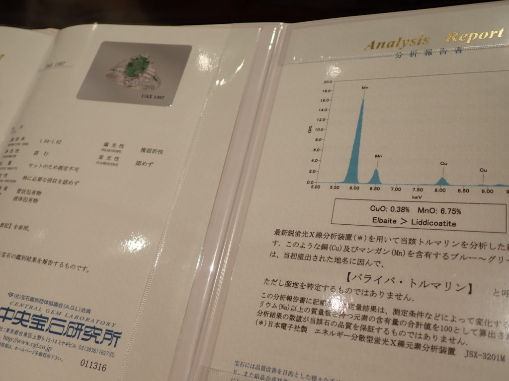そこで、中央宝石研究所に「パライバ分析表付き鑑別書」を依頼してみることにしました。
