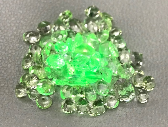 通常は濃い色味もなくどちらかというと地味なイメージの宝石ですが、ブラックライトを浴びると様変わりするので、この変化がマニア心をくすぐられますよね!