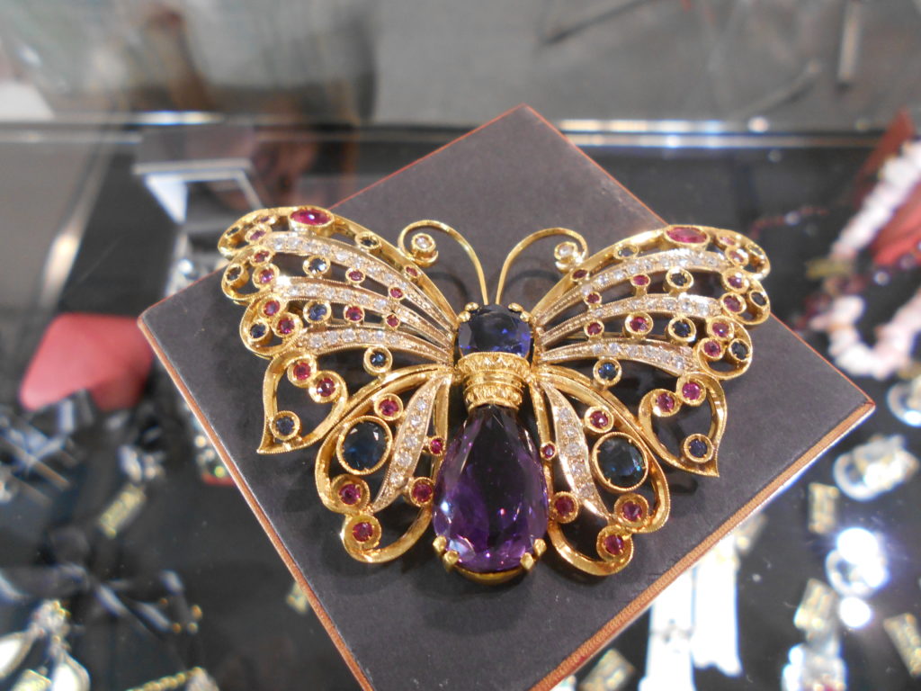 大変美しい蝶のブローチは、巨大なアメジストとサファイア、ルビー、ダイヤモンドなどが配された豪華な作品。イタリアらしい繊細な金細工と色使いに、一目惚れしてしまいました。価格は2,600ポンド(約37万円)です。