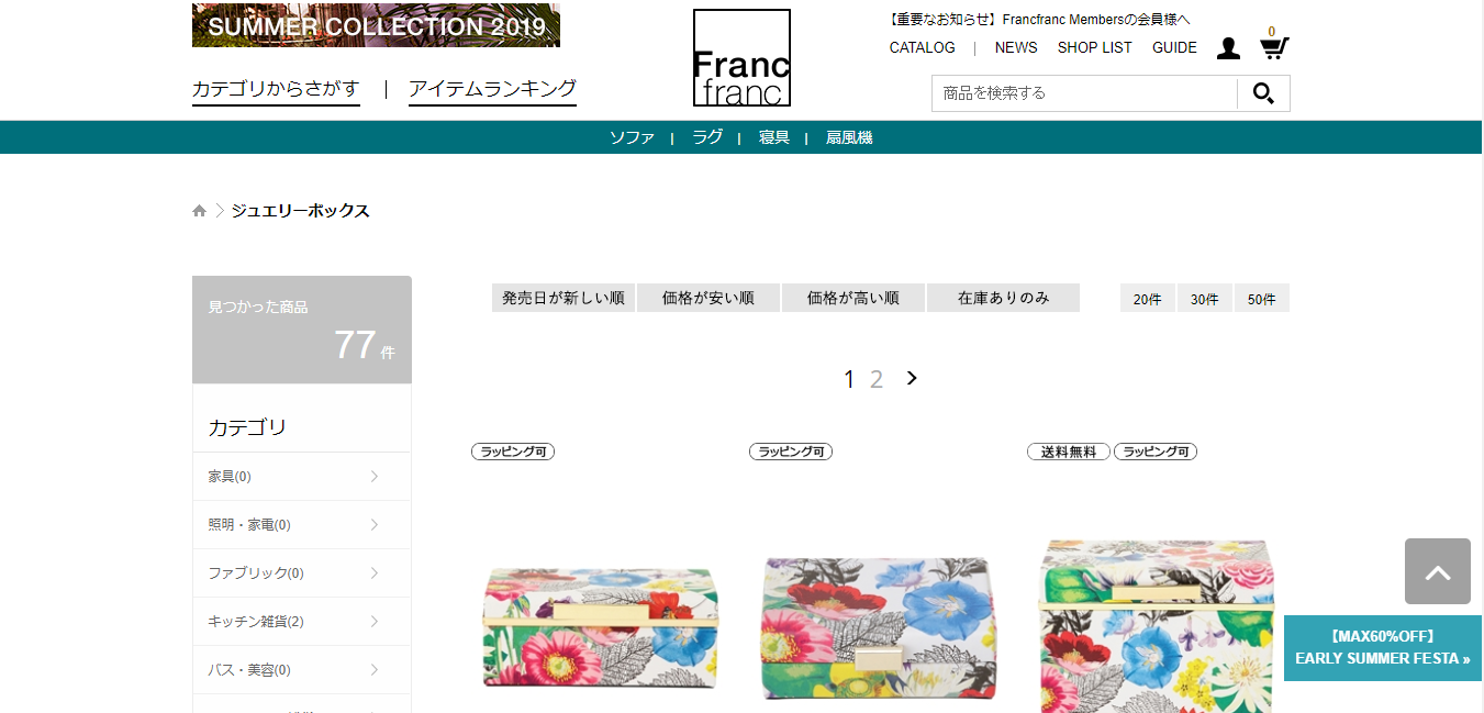 オシャレな雑貨を扱うフランフランでは、手頃な価格でセンスの良いジュエリーボックスが揃っています。