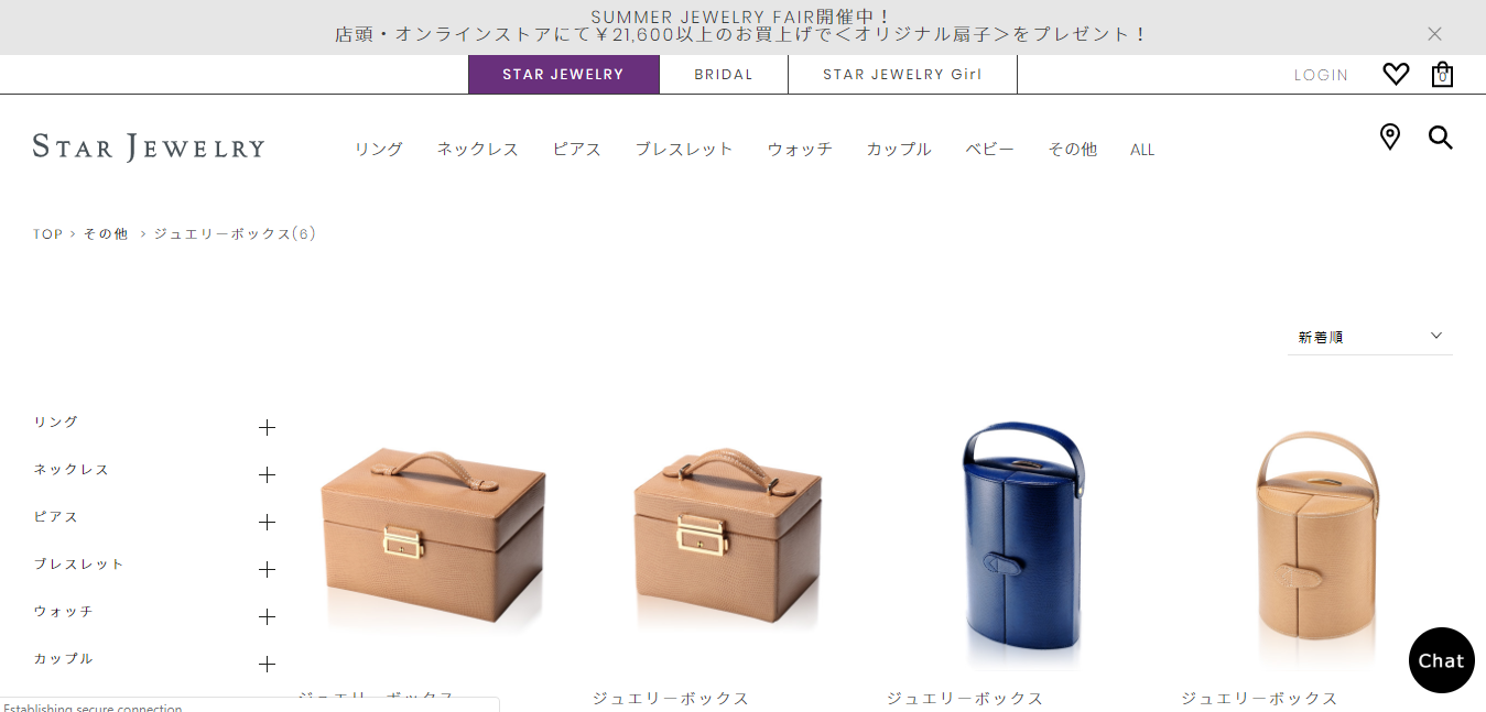 スタージュエリーでは、ハンドルの付いた持ち運びしやすいジュエリーボックスを展開しています。