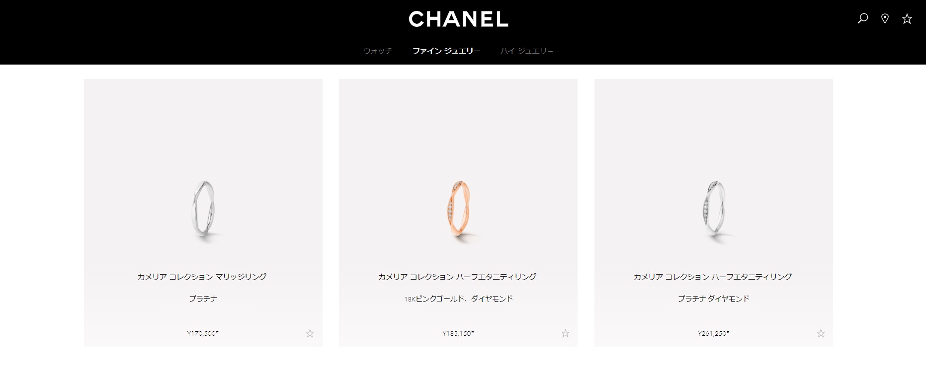 「カメリア」にはマリッジリングの展開もあり、シンプルな中にもシャネルらしさが感じられ、多くの女性から愛されています。