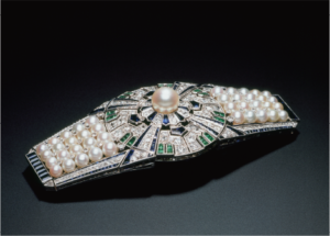 ミキモト真珠島ホームページには、帯留 矢車が詳しく解説されていますが、プラチナとK18WGの台座に、ダイヤモンド、エメラルド、サファイア、真珠が施されており、西洋と東洋の美を織り交ぜたミキモトスタイルが貫かれた逸品です。パリ万博では非常に高い評価を得て、昭和初期のジュエリー史に名を残す作品となったようです。万博終了後はニューヨークでひらかれたオークションで販売されました。