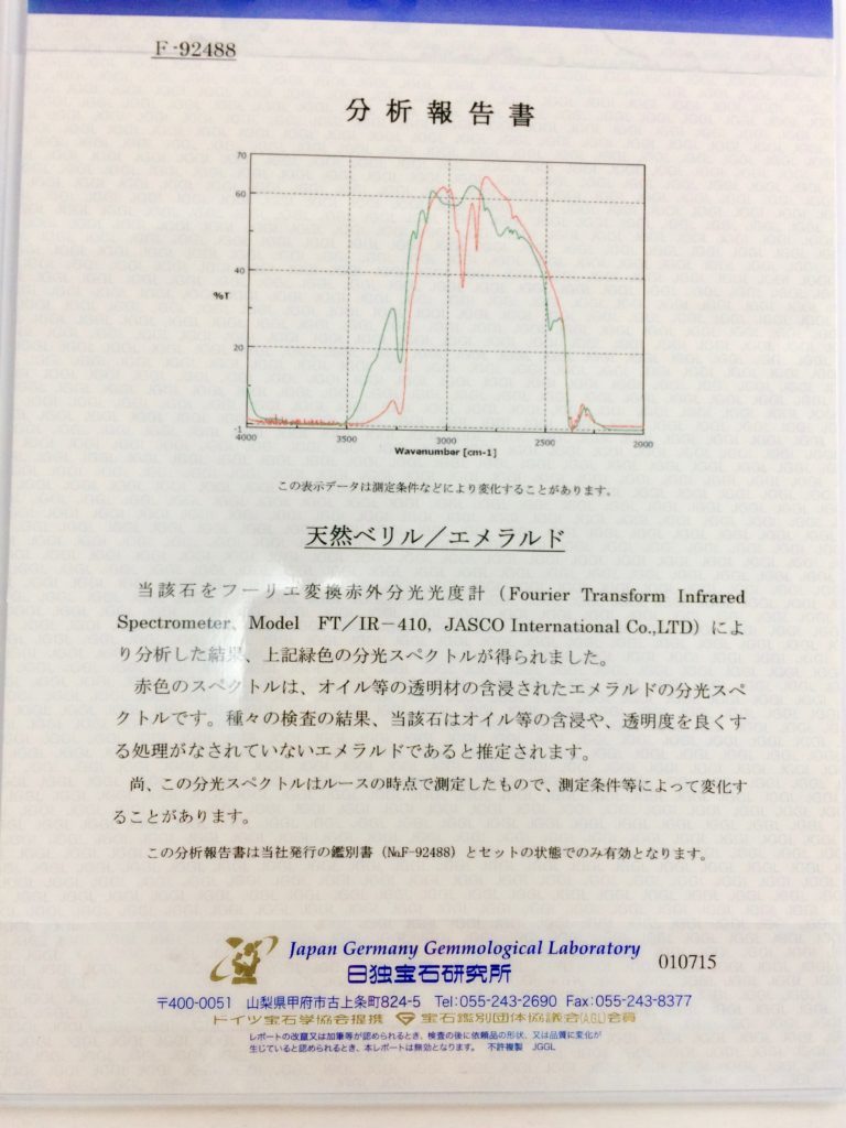 もっと細かくいうと、ノンオイルエメラルドの鑑別書には、鑑別結果の他に、分析結果を記載した「分析報告書」が付随されていなければなりません。