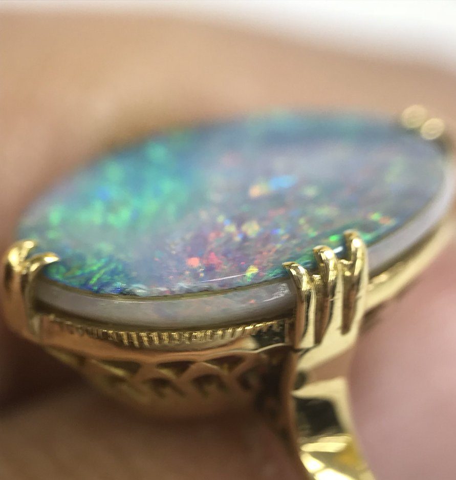 合成オパールとの違いは、ダブレットオパールは上の部分は天然オパールを使って作っていることです。張り合わせてはいるものの、表面に見えているのは宝石ですから、見分けるのが難しいといえます。