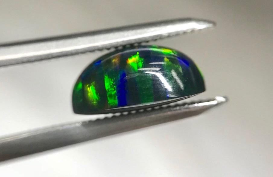 合成オパールは表面から見ると、ブルーやグリーンの遊色効果が確認できます。