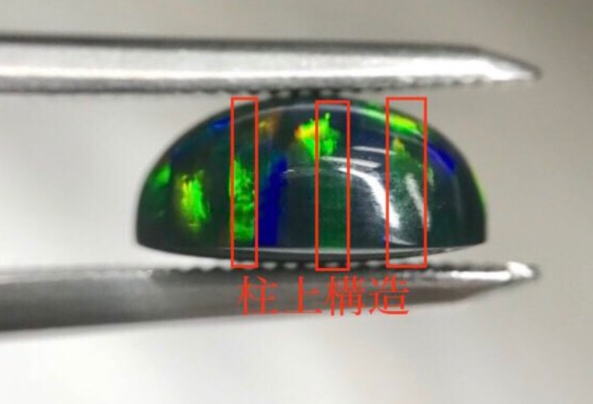 また、合成オパールの場合はオパールの側面、横の部分から覗くと柱のように見える光が確認できます。