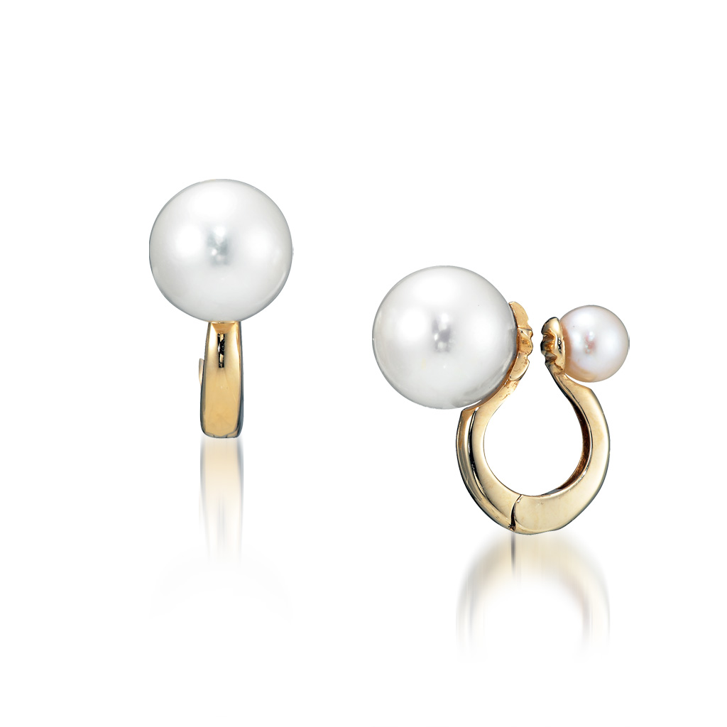 大小のアコヤ真珠を気分やシーンによってリバーシブルに楽しめるイヤリング。フォーマルシーンだけでなく、デイリーにも活躍してくれそうです。
