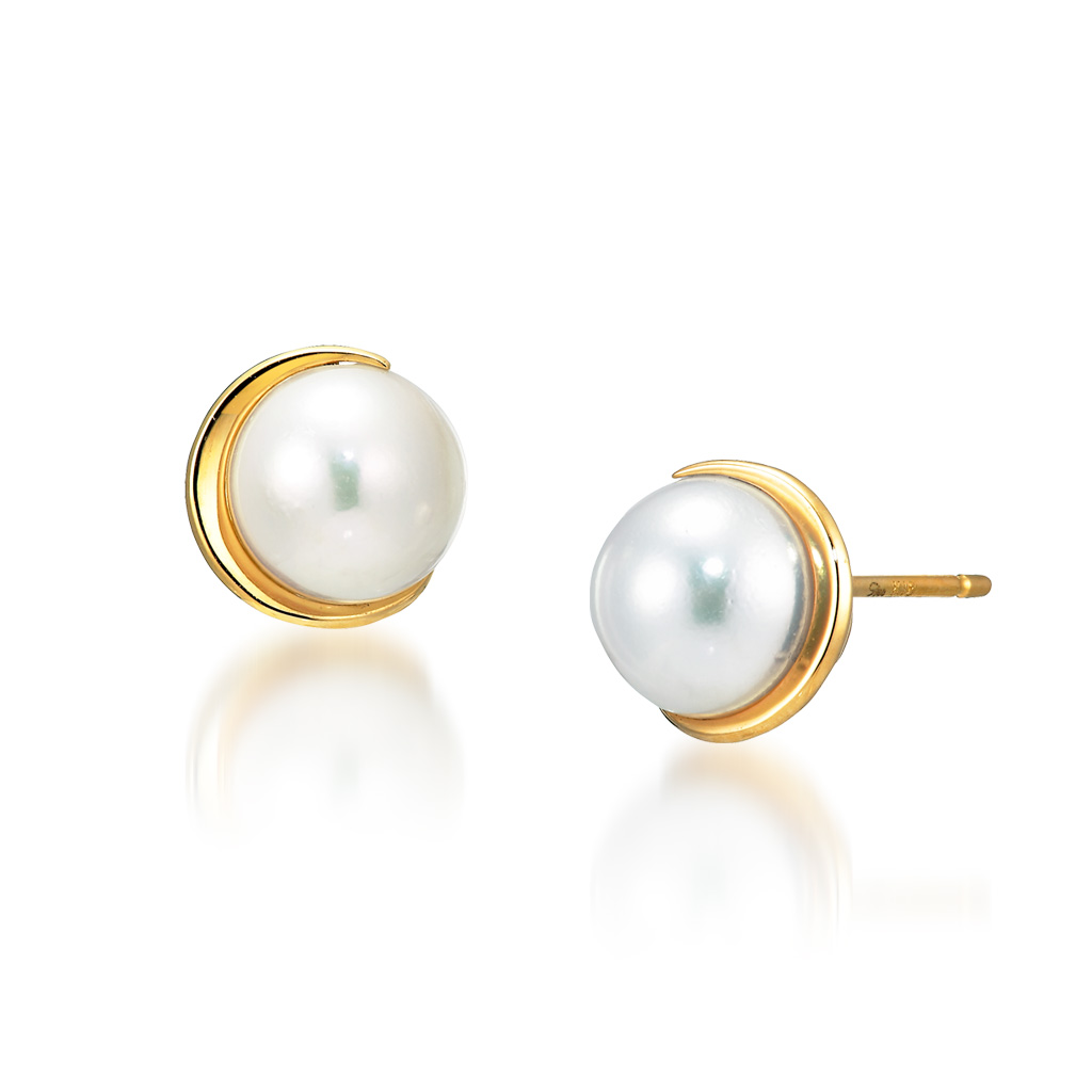 アコヤ真珠をイエローゴールドの月が包み込むように支えているピアス。シンプルなデザインでありながらも、スタージュエリーらしいファンタジックな魅力のあるデザインです。