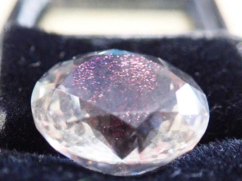 一見、ただの透明のクォーツやスモーキークォーツなのですが、光を当てるとキラキラとピンクに光るのが特徴です。写真では伝わりにくいのですが、本当にキラキラと繊細な光り方をするので、いつまでも眺めていられます。
