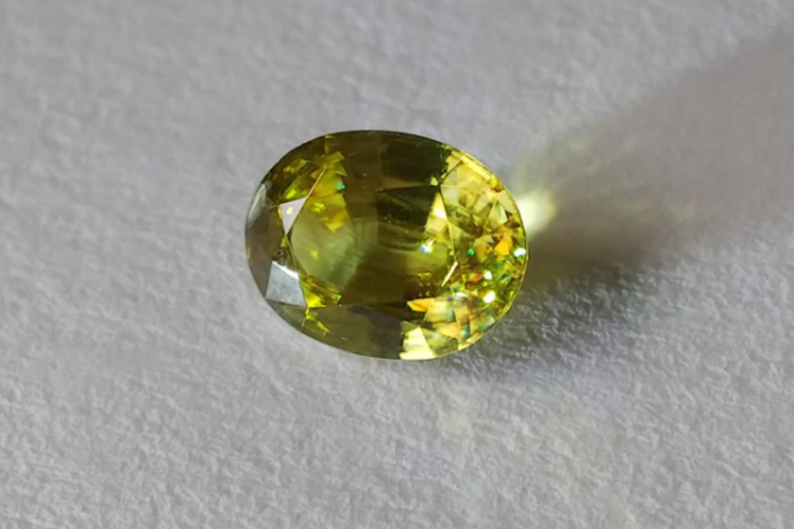 スフェーンは光の分散率が高く、ダイヤモンドよりも強いファイアを発します。