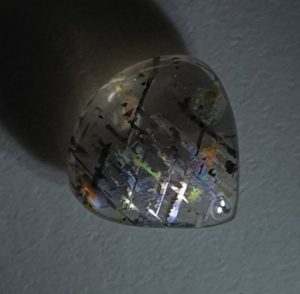 ヘマタイトやチタン鉄鉱の内包物が虹色の格子(ラティス)状に現れます。