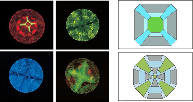 HPHT法による合成ダイヤモンドは、幾何学的なカラーゾーニングを見せる事が多く、反対にCVD法による合成ダイヤモンドは、色合いが均一です。