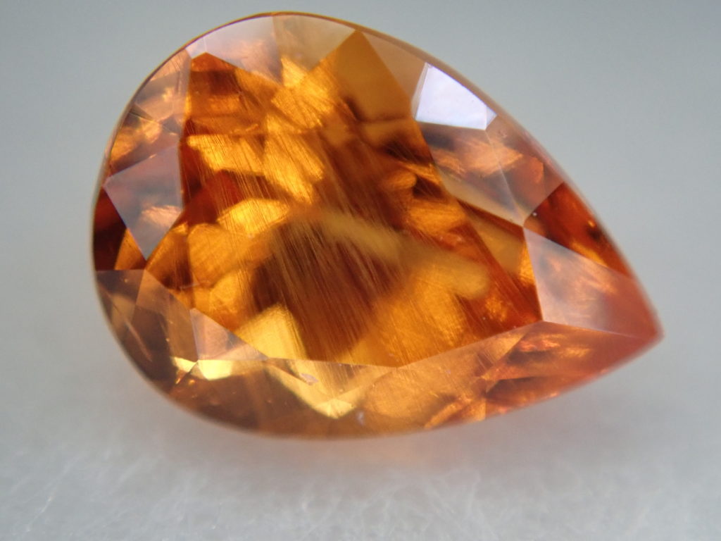 こちらは、色鮮やかなネオン感のつよいスペサルティンガーネットです。この発色の良さもすごいなあと思っていたのですが、このルースの最大の特徴は「ホーステール」がインクルージョンとして含まれていること。
